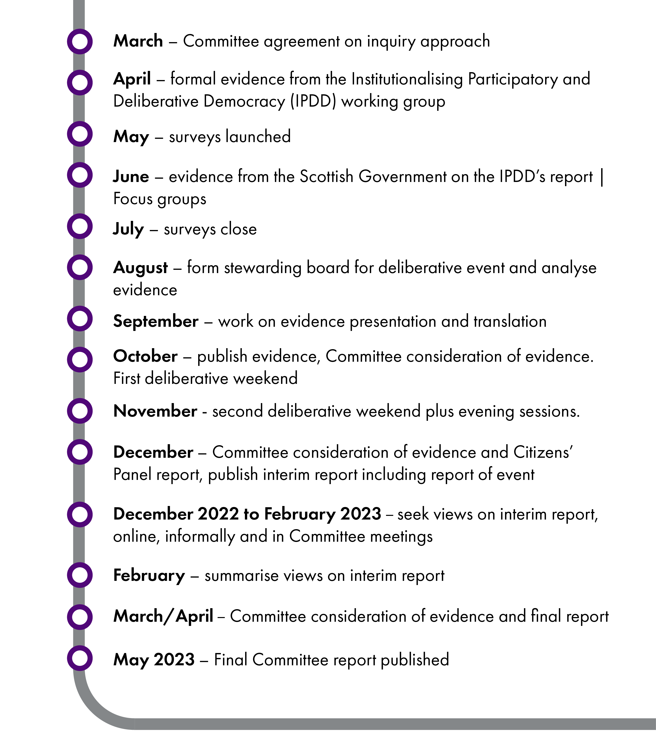 The Panel process included team building; learning about the Scottish Parliament, participation and deliberative democracy; questioning witnesses; deliberation and consensus-based decision-making.