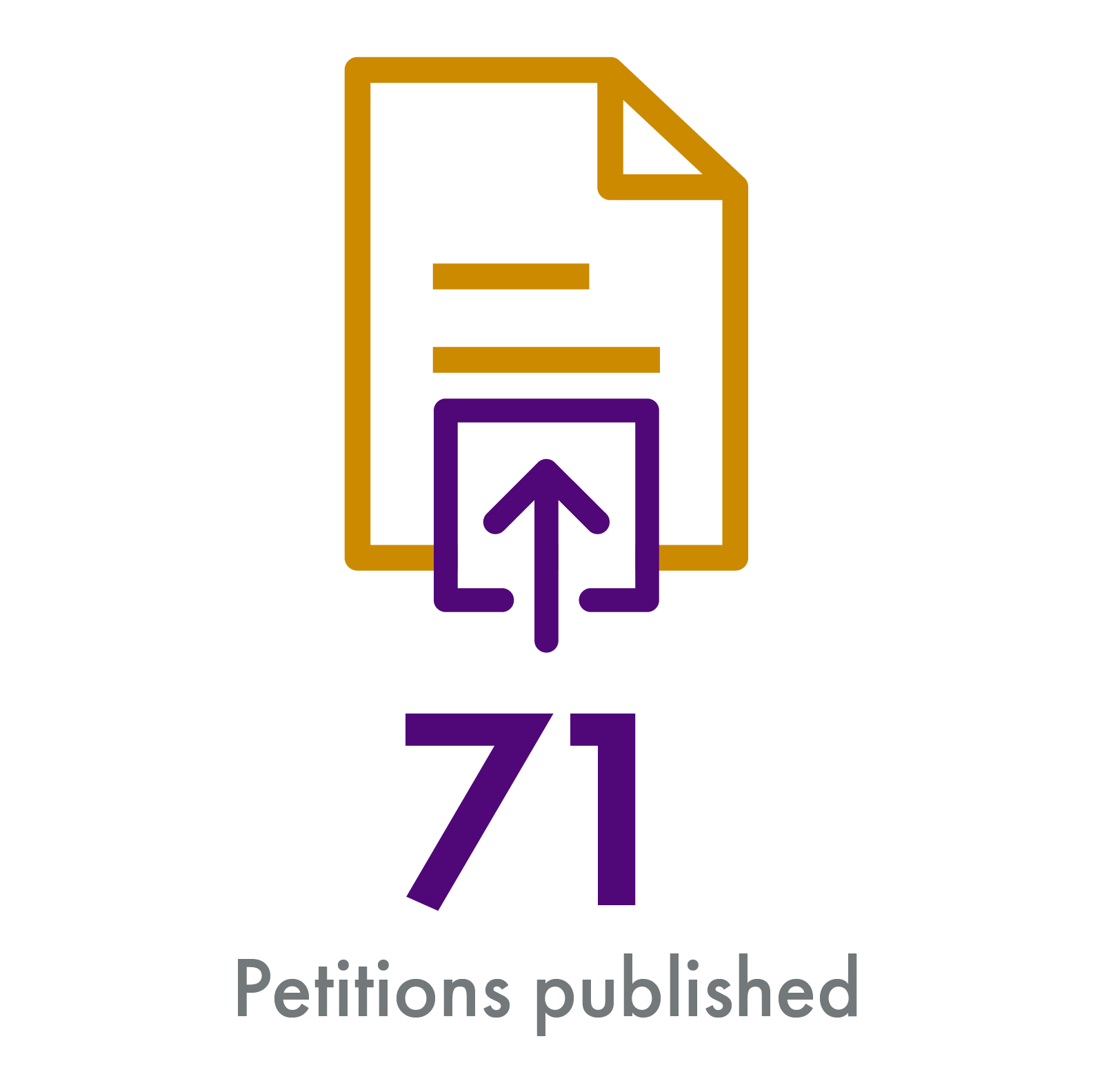 1. 15 new Petitions were submitted by groups or organisations and 56 were submitted by individuals.