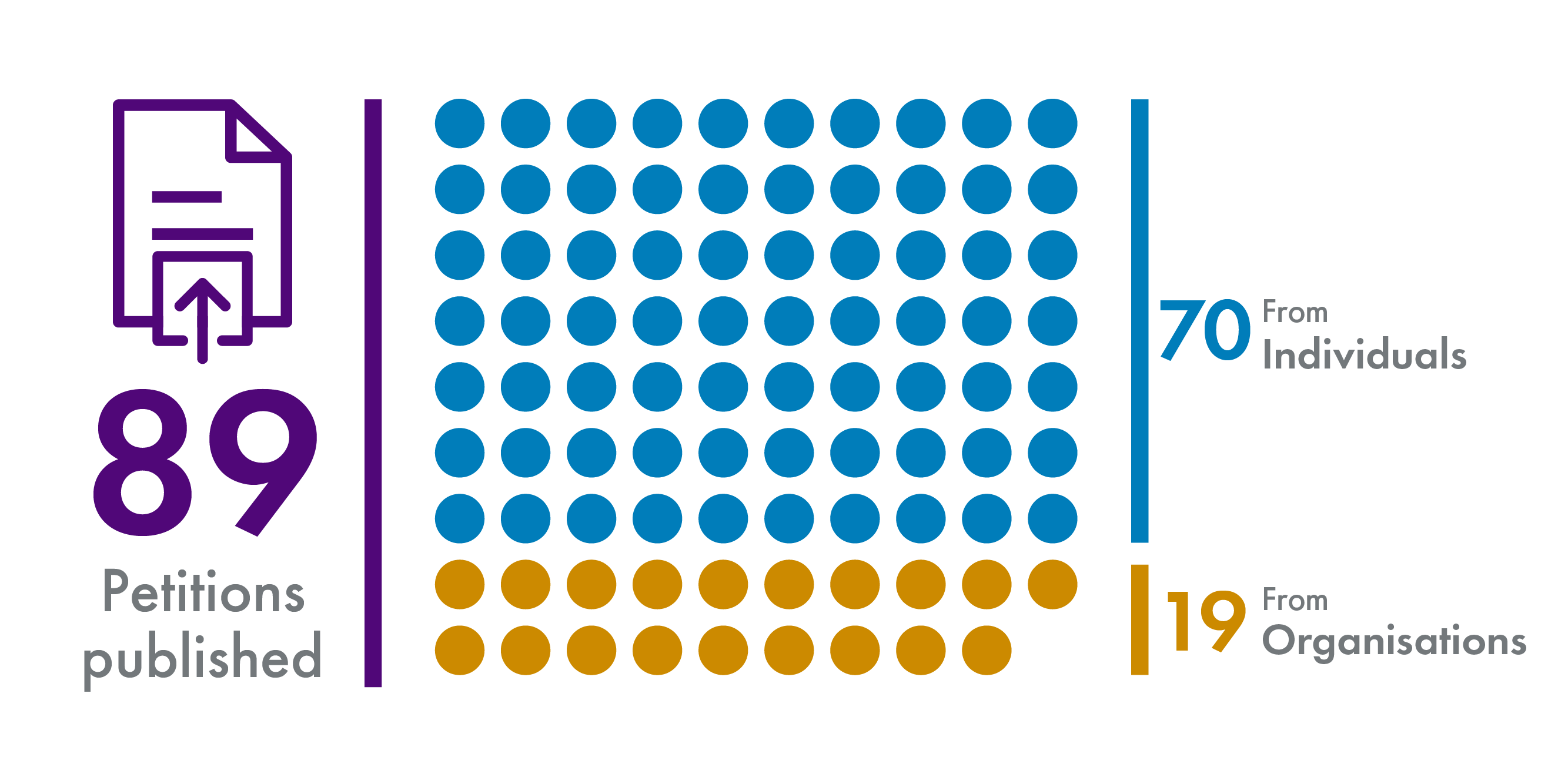 Petitions may be lodged by individuals or organisations. This parliamentary year, 89 petitions have been published, 70 that were submitted by individual petitioners and 19 that were submitted by groups or organisations.