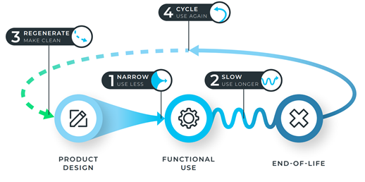 The 2023 global Circularity Gap Report sets out a 'four flows' model for a circular economy where we (1) ''narrow' by using less material in product design, (2) 'slow' the flow of resources by using resources for longer, (3) 'regenerate' products and materials for use again, and (4) 'cycle' materials for use again (see Figure 1 below).