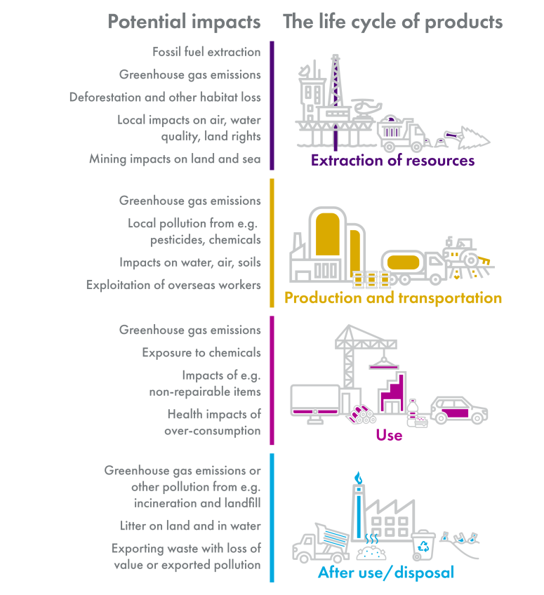 • other environmental impacts across the lifecycle of products we consume- from extraction through to production, use and disposal - including on biodiversity, air quality, and the water environment - which in turn can have implications for our health and wellbeing