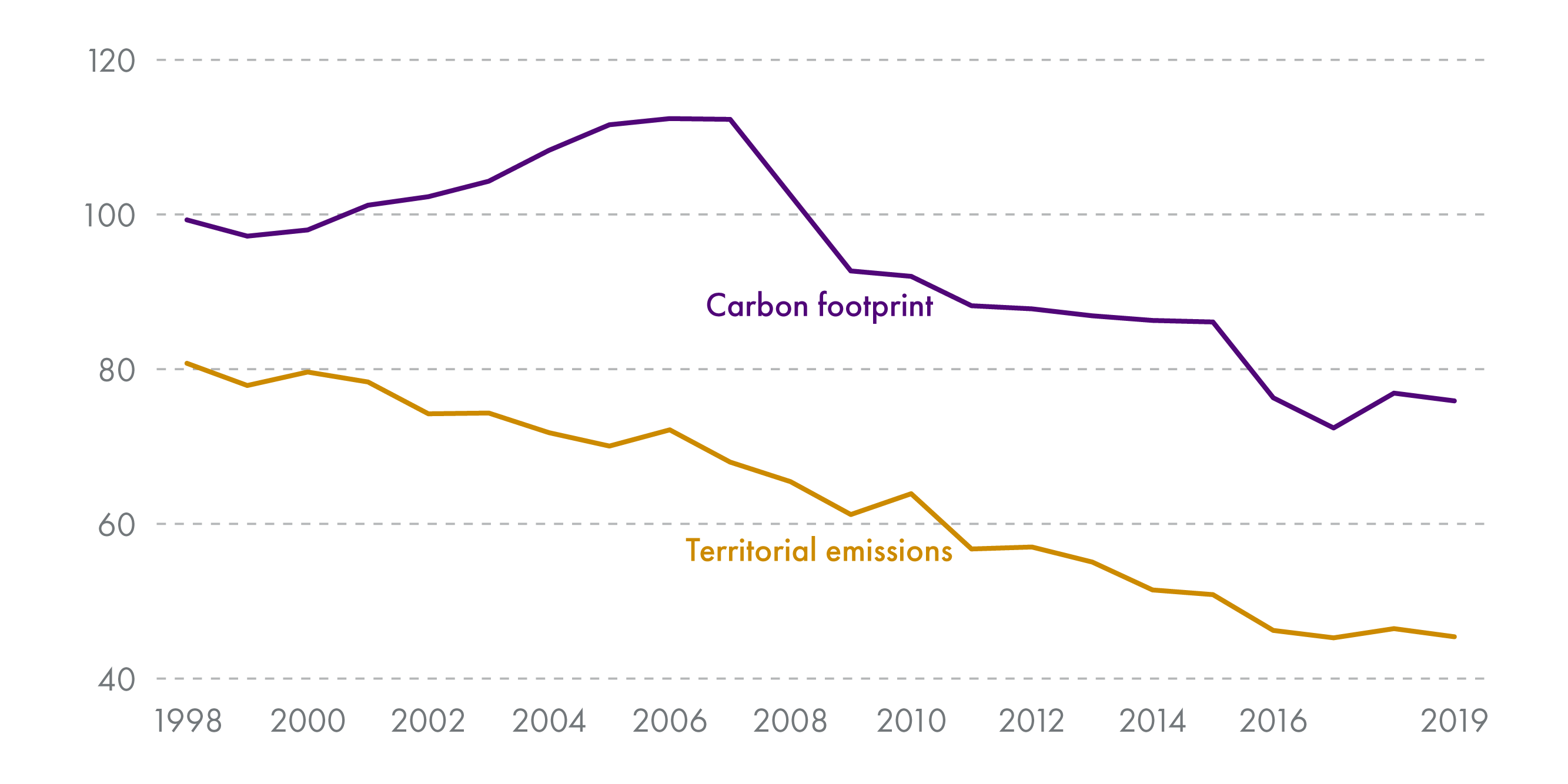The report shows that Scotland's consumption emissions are notably larger than those based on production accounting. Whilst the carbon footprint (consumption emissions) fell by 23.6 per cent between 1998 and 2019, equivalent greenhouse gas emissions on a territorial basis (production emissions) fell by 43.8 per cent over the same time period. These trends are shown in Figure 4 below.2