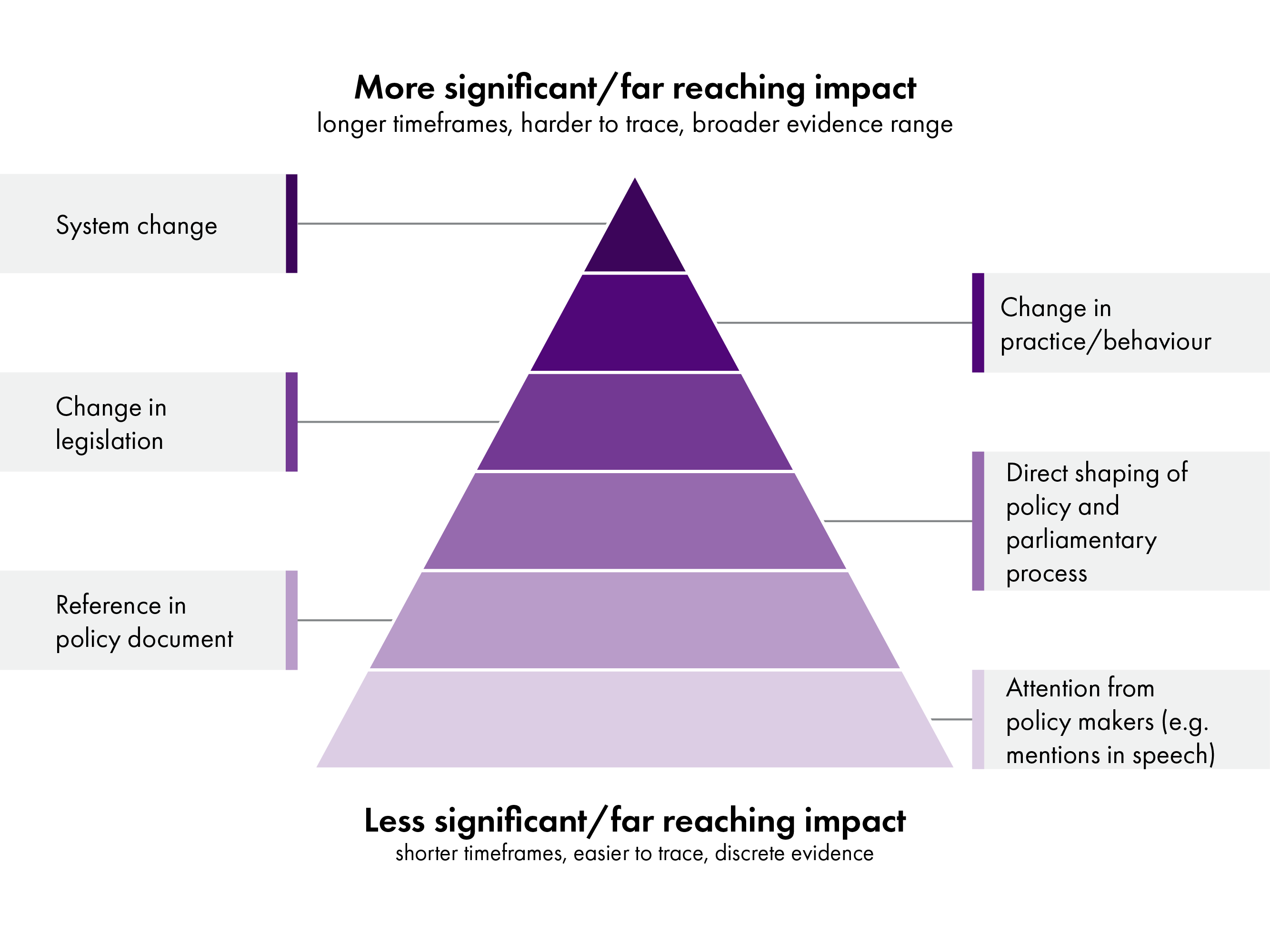 | Area of impact | Instrumental impacts:Changes to how things work and what happens: policies, behaviour, practice | Conceptual Impacts:Changes to how people think: knowledge,understanding, attitudes | Capacity-building impacts:Changes to what people do: skills development, ability, confidence |