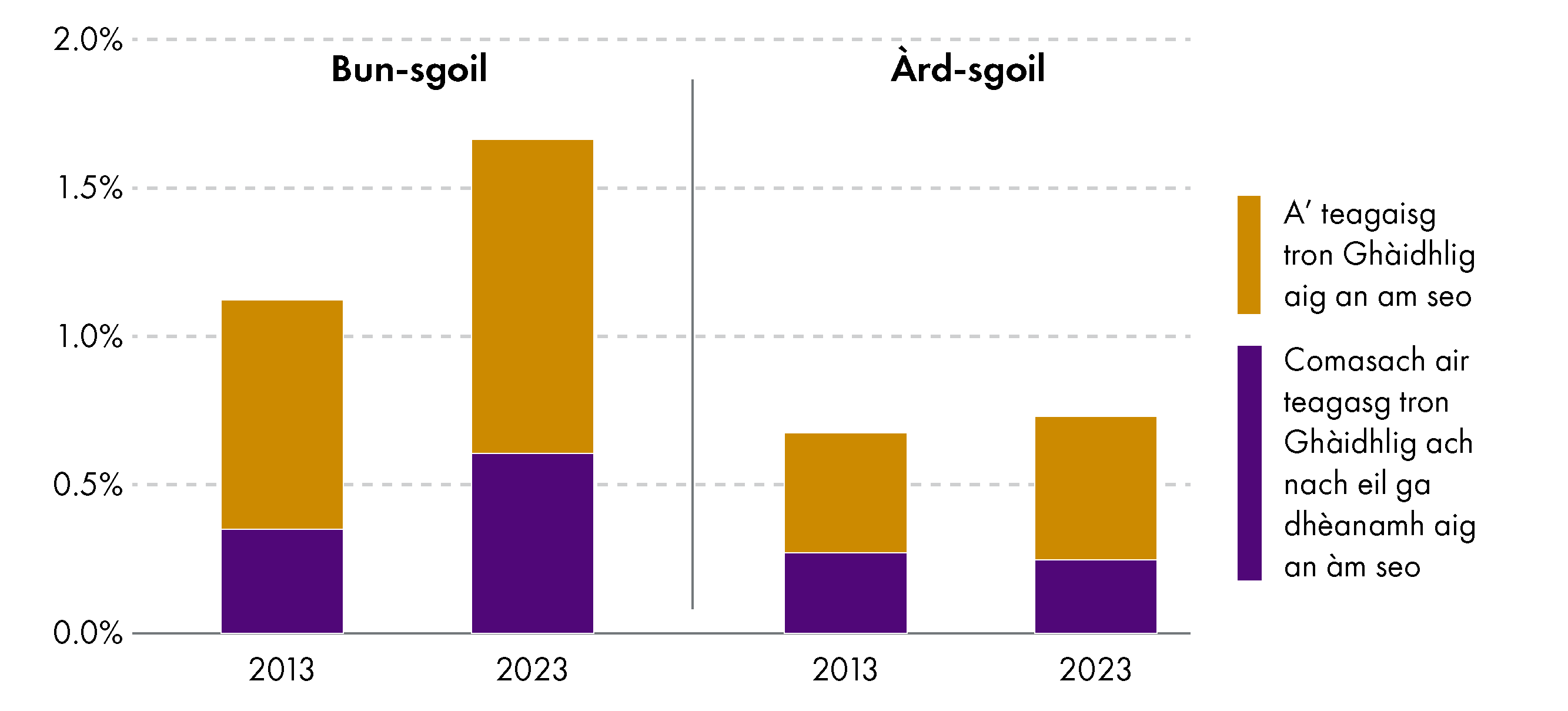 Anns na deich bliadhna a dh’fhalbh, tha àrdachadh air tighinn sa chuibhreann de sgoilearan a’ gabhail pàirt ann am FtG agus FLI. Tha àrdachadh cuideachd air tighinn air an àireamh thidsearan a tha a’ teagasg tron Ghàidhlig an-dràsta no a b’ urrainn teagasg tron Ghàidhlig.