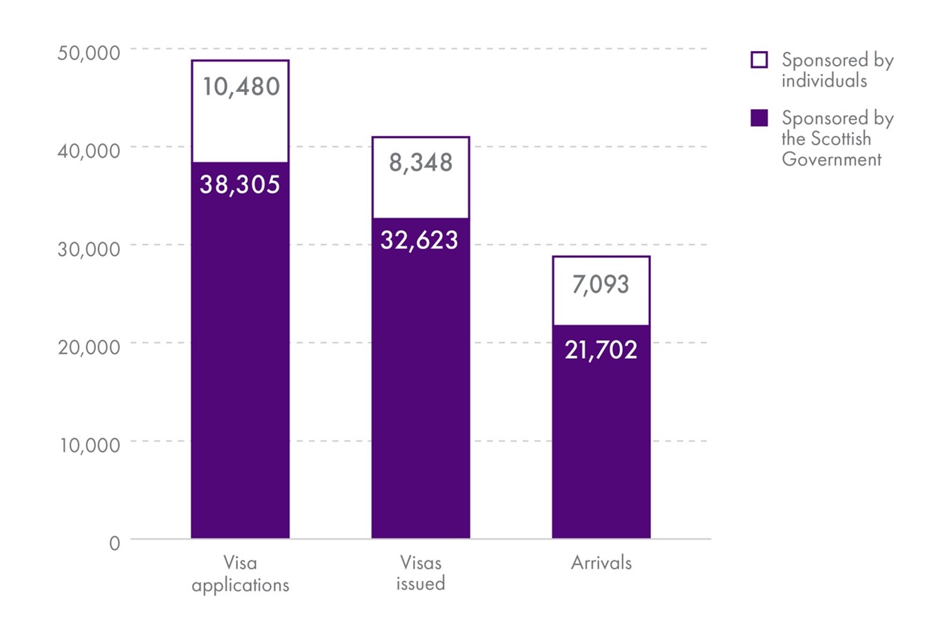 In total 21,702 individuals arrived in the UK through the Scottish Super Sponsor Scheme (i.e. by naming the Scottish Government as their sponsor on their Homes for Ukraine visa application). This figure represents 13.1% of the total number of people resettled to the UK through sponsorship and 75% of the total number of arrivals of displaced persons from Ukraine to Scotland through sponsorship.