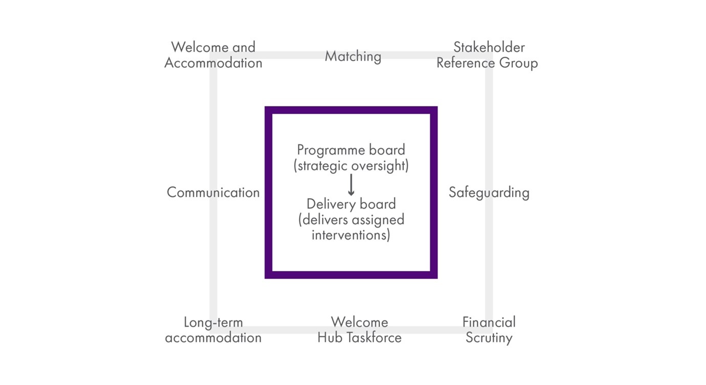 Following the November 2022 review of the Super Sponsor Scheme, a new governance structure was also established for the scheme. This maintained the Gold -> Silver teams (rebranded as Programme Board and Delivery Board) and created alongside this command structure various working groups focused on the use of Welcome Hubs and related accommodation for arrivals, issues for children and families, safeguarding, trafficking, concerns, matching processes and housing options (see Figure 6).
